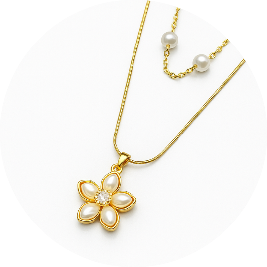 Discover effortless elegance with our stunning Layered Gold Chain Necklace. This beautiful set features two delicate gold-tone chains, one adorned with a row of small, lustrous pearls and the other featuring a chic floral pendant....