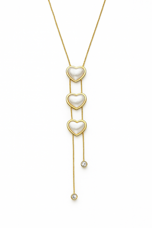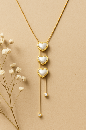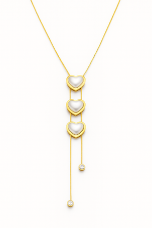 Elevate your style with our exquisite Elegant Triple Heart Pendant Necklace. This unique piece features a delicate gold-tone chain that holds three beautiful heart pendants, each with a smooth, pearlescent finish resembling mother of pearl. Below the hearts, two sparkling cubic zirconia stones dangle gracefully, creating a sophisticated and eye-catching lariat design.