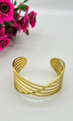 Make a bold, modern statement with our Modern Gold Cuff Bracelet. This eye-catching piece features a unique, sculptural design with intersecting lines that wrap elegantly around the wrist. The polished gold-tone finish adds a touch of sophistication and luxury, making it a standout accessory for any occasion.